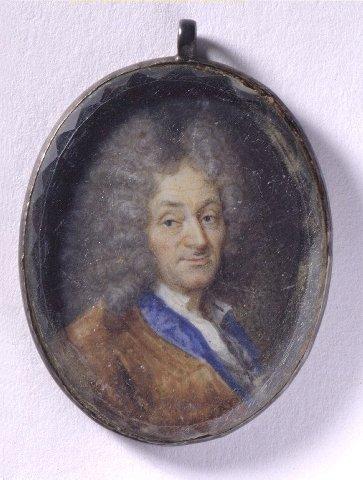 Soikea miniatyyri, miehen rintakuva, vartalo oikealle. Suuri harmaa allonge-peruukki, siniset silmät. Ruskea takki, kirkkaansininen kaulus. Valkoinen avonainen paita. Mustanharmaa tausta. Kullattu hopeakehys. Kehyksen kääntöpuolella kaiverruskoristelu. Miniatyyrin päällä reunoista fasetoitu paksu lasi.