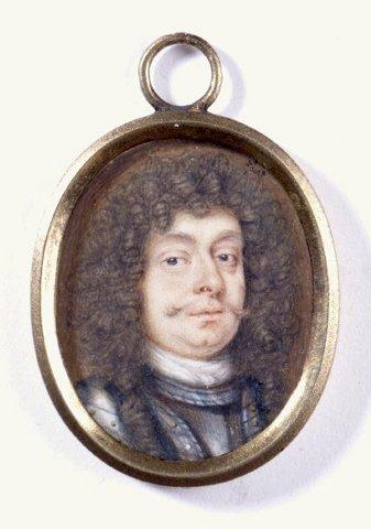 Miehen rintakuva oikealle. Ruskea kihara peruukki, viikset. Tummat silmät. Harmaasininen haarniska jossa kullanväriset niitit. Valkoinen kaulaliina. Ruskea tausta. Kuvan päällä lasi. Kullattu hopeakehys (ei alkuperäinen), jossa ripustuslenkki.