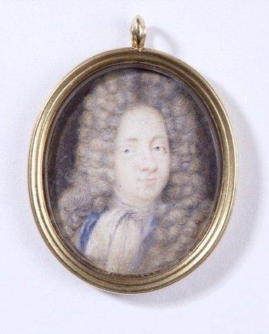 Miehen rintakuva, vartalo vasemmalle, pää oikealle kääntynyt. Suuri vaaleanruskea kiharaperuukki, siniharmaat silmät. Vaaleanruskea takki, sininen kaulus/vuori. Valkoinen kaulaliina. Tummanharmaa tausta. Kuvan päällä lasi. Kullattu metallikehys jossa ripustuslenkki.