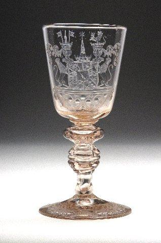 Jalallinen viinilasi punertavaa lasia, pieniä ilmakuplia. Korkeassa jalassa profiloitu nappi ja pallo. Maljassa kaiverrettu Armfeltin vapaaherrallisen suvun vaakuna, jalan pohjassa kaiverrettu seppeleaihe.