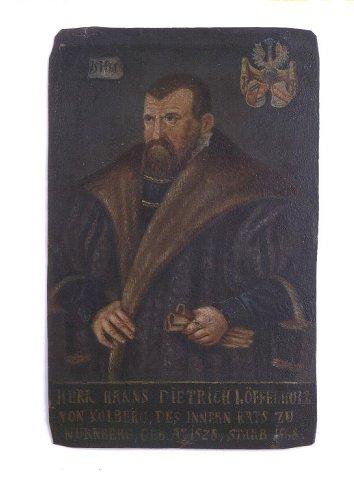 | huomiot | Osan materiaali: metalli; Merkintätekniikka: maalaus; Osa: maalauspohja; Kirjoitus: HERR HANNS DIETRICH LÖFFELHOLZ VON KOLBERG. DES INNEREN RATS ZU NÜRNBERG GEB. Ao 1528. STARB 1568; Erityispiirteet: pystysuorakaide; Aineistotyyppi: esine |