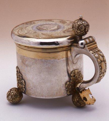 Kolme valettua pallojalkaa ja pallomainen peukaloripa ovat hedelmäaiheisen koristelun peitossa, jalkalevyssä on valettu hedelmäkoristelu ja paksussa kädensijassa pakotettu hedelmäaiheinen koristelu. Koristeosat kullattu. kanteen on upotettu Uudenkaupungin rauhan muistoraha v. 1721 (Fridericus I = Fredrik I); reunaa kiertää kaiverrettu kukka- ja lehtiköynnös, kullattu. Rahaa kiertää kirjoitus: SAMUEL * ALOPAEUS-=- MARIA-=- TESCHE-=- Ao 1725.