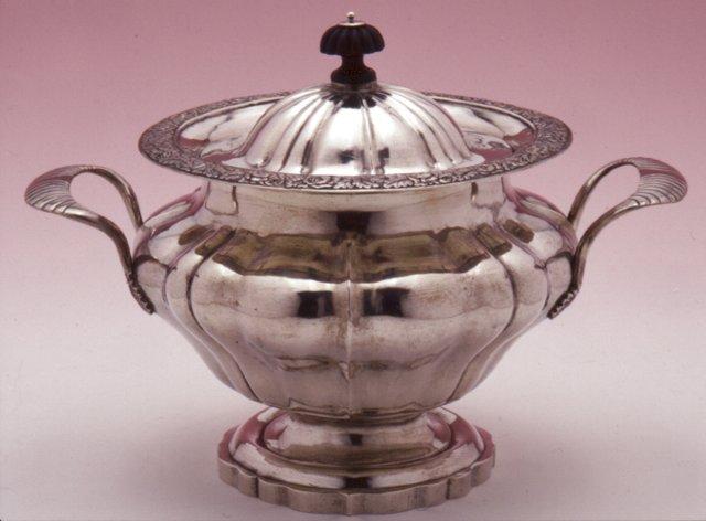 Pyöreä, pullea, jalallinen. Koristeena pystyt, pulleareunaiset uurteet. Ulospäin taivutettua reunaa koristaa ruusunauha. Kuperassa kannessa on musta puunuppi. Pyöreän jalustan reuna on kaareileva. Maljan sisusta on kullattu.