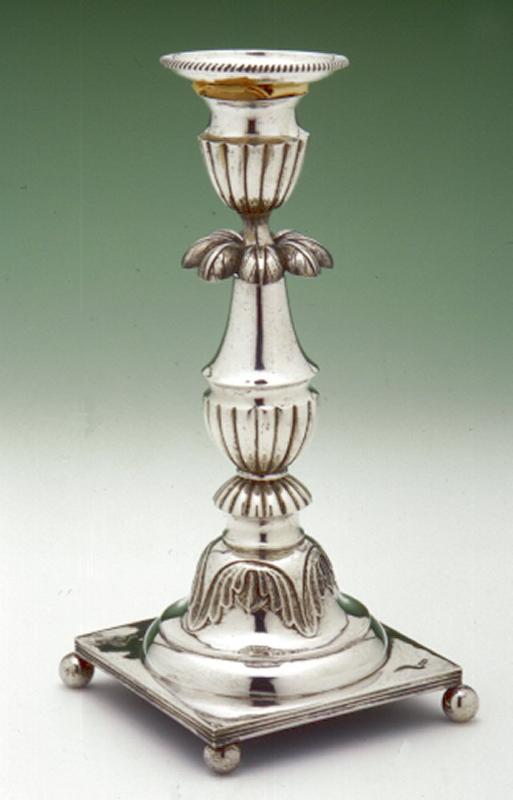 Kynttiläpesä uurnanmuotoinen, varsi runsaasti profiloitu, jalka pyöreä, kellomainen, jalusta sileä, nelikulmainen laatta, alla neljä kuulajalkaa. Talivati pyöreä, irtonainen. Kynttilänjalat runsaasti koristellut. Pesän alapuolella on lehdykkäkaulus, talivadin reunassa on nyörinauha, pesä ja varsi on koristettu rivillä pystyjä, kapeita kupuroita, jalan ympäri kiertää akantuslehtiaiheinen reliefi.
