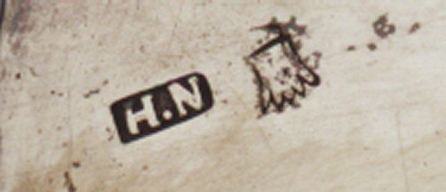 | huomiot | Osan mitat: pituus 8.50 cm; leveys 8.50 cm; halkaisija 12.00 cm; halkaisija 5.20 cm; Leima: kruunu; H.N; Monogrammi: AR; Tyyli: biedermeier; Koristelu: lehdykkäkaulus, akantuslehtiä, nyörinauha, kapeita pystykupuroita; Merkinnän kuvaus: yhteen kietoutuneet; suorakaiteessa; Merkintätekniikka: kaiverrus; Osa: jalkalaatta; jalkalaatta kulmittain; talivati |