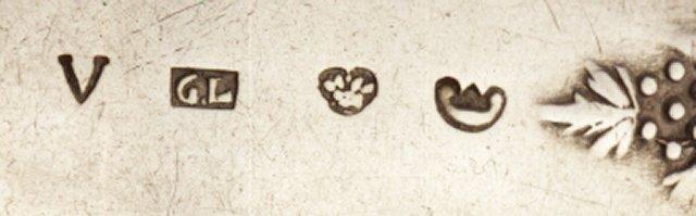 | huomiot | Osan mitat: pituus 8.00 cm; leveys 4.50 cm; Leima: V; G.L; kruunu; Tyyli: biedermeier; Koristelu: viinirypäle, viininlehti; Merkinnän kuvaus: suorakaiteessa; Osa: pesä |
