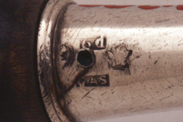 Hopeaa, varren yläosa on sorvattua, mustaksi maalattua puuta; pieni luunuppi. Pesä on syvä, toiselle sivulle suippeneva; varsi liittyy pesään lehdenmuotoisena kielekkeenä.