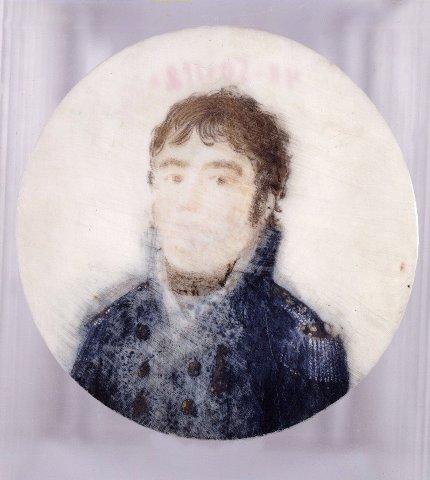 Vasemmalle kääntyneen miehen rintakuva. Ruskeat, kiharat hiukset. Sininen asetakki, korkea kaulus, kullanväriset napit ja epoletit. Musta kaulaliina. Väripinta kulunut/vahingoittunut, kasvojen alaosasta ei näy juuri mitään. Vaalea (maalaamaton) tausta. Ei kehystä.