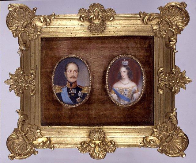 Kaksi miniatyyriä samaan kehykseen kiinnitettyinä. Kapeissa messinki- tai kultakehyksissä olevat miniatyyrit on kiinnitetty ruskealla sametilla verhoillulle taustalle. Tätä ympäröi leveä koristeellinen kullattu metallikehys, jonka kulmissa simpukka-aiheiset koristeet. Kääntöpuolella lappu jossa venäjänkielistä tekstiä. Vas.: keisari Nikolai I, rintakuva, katse oikealle. Vaaleanruskeat hiukset ja viikset, siniset silmät. Musta univormu, jossa punainen kultakirjailtu pystykaulus, kultaiset napit ja epoletit. Takissa punaiset kanttaukset. Musta kaulaliina. Sininen kunniamerkin nauha, rinnassa useita kunniamerkkejä. Siniharmaa tausta. Oik.: keisarinna Maria Feodorovna kruunajaisasussa, puolivartalokuva, pää ja katse vasemmalle kääntyneet. Ruskeat hiukset, korkkiruuvikiharat, siniset silmät. Valkoinen, olkapäät paljastava, kultakirjonnalla ja kärpännahalla koristeltu puku, sininen olkanauha. Puvun miehustassa jalokivikoruja ja rintatähti. Helmikaulanauha, pieni umpikruunu. Taustalla punainen verho.