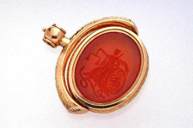Berlokinmuotoinen sinettileimasin karneolia kultakehyksessä. Sinettileimasimessa näkyy Justitia-hahmo vaakoineen ja miekkoineen, hänen jalkojensa juuressa käärme, hän nojautuu soikeaan kilpeen jossa on monogrammi MW. Sinettileimasimen selkäpuolella kapseli, jossa reiällinen kansi.