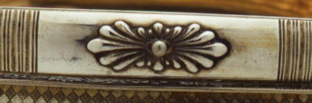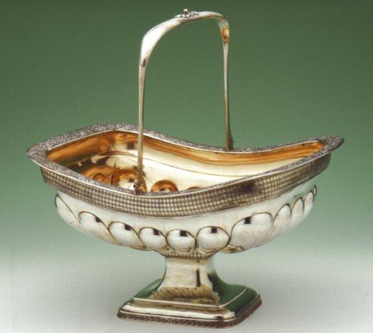 Osan mitat: pituus 27.40 cm; leveys 22.80 cm; Leima: kruunu ja vene; G.LINDROOS; kruunu; A 2; Osan Pintamateriaali / käsittely: kultaus; Tyyli: biedermeier; Koristelu: stanssattu kukka-, lehti- ja viininlehvänauha; Merkinnän kuvaus: suorakaiteessa; Osa: kori; sisusta