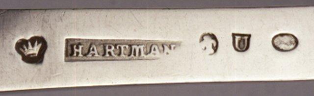 | huomiot | Osan mitat: pituus 8.00 cm; Nimikirjaimet: HR; Leima: lyhde; HARTMAN; kruunu; U; Tyyli: biedermeier; Koristelu: simpukka; Merkinnän kuvaus: koristeelliset kaunokirjoituskirjaimet painetussa soikiossa; suorakaiteessa; soikiossa; Osa: pesä |