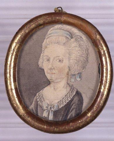 Soikea miniatyyri. Naisen rintakuva vasemmalle. Pöyheä, korkea, puuteroitu kampaus, hiuksissa sininen nauha. Avokaulainen harmaa puku, röyhelön reunustamassa kauluksessa sininen nauharuusuke. Harmaa tausta. Pyöreäksi profiloitu puinen kullattu kehys. Kultauksen alta näkyy punaista väriä. Ripustuslenkki, jossa pätkä narua. Kuvan päällä lasi.