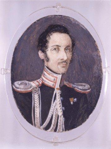 Soikea miniatyyri. Rintakuva oikealle, mies adjutantin univormussa. Tummanvihreä univormu, hopeanväriset epoletit, korkea kaulus jossa punaista nauhaa. Kunniamerkkejä. Musta kihara tukka, viikset, ruskeat silmät. Teräksenharmaa tausta. Muovilevyjen suojaama, ei kehystä.