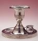 Pyöreä, kaartuen kohoava jalkalevy, korkeammassa reunassa lehtiraita. Kellomainen kynttilänpesä, irrallinen pesään työnnettävä vaakasuora kaulusrengas. Jalassa, pesässä ja kauluksen reunassa vinoneliöaiheista kaiverruskoristelua.