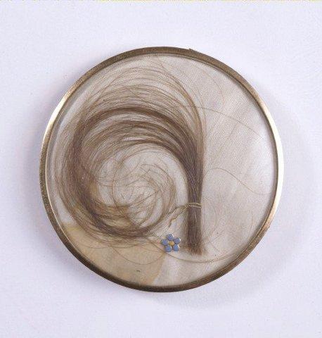 Nuoren miehen rintakuva hieman oikealle, katse eteen. Harmaat hiukset, ruskeat silmät. Sininen univormu, valkoinen liivi ja valkoinen kaulaliina. Takissa kaulus kultakirjailtu. Tausta harmaanvihreä. Kapea kultainen kehys. Kuvan päällä ja kääntöpuolella kupera lasi. Kääntöpuolella lasin alla valkoisen silkin päällä vaaleanruksea hiuskiehkura ja pieni lemmikinmallinen emalioitu koristeneula.