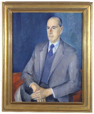 Miehen puolivartalokuva vasemmalle. Siniset silmät, harmaat hiukset. Istuu tuolissa kädet sylissä, vasemmassa kädessä nimettömässä sormus. Harmaa takki ja pujoliivi, sinertävä paita, sininen solmio. Taustalla vaalean ja tumman sinivihreä sekä alalaidassa ruskehtavanpunainen. Profiloitu kullattu puukehys.