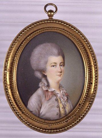 Nuoren naisen rintakuva oikealle. Siniset silmät; korkea, harmaaksi puuteroitu kampaus, niskassa suuria kiharoita. Harmaa, punakauluksinen auki oleva takki, keltainen liivi tai puku, pitsikaulus. Harmaanvihreä tausta. Kahdella helmisauvalla koristettu messinkikehys, jossa ripustuslenkki ja -rengas.