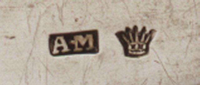 | huomiot | Osan mitat: määrittelemätön ulottuvuus 6.20 cm; määrittelemätön ulottuvuus 7.80 cm; Leima: AM; kruunu; Tyyli: biedermeier; Merkinnän kuvaus: suorakaiteessa; Malli: snekka; Osa: pesä |