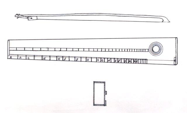 | huomiot | Osan mitat: pituus 70.00 cm; paino 60.00 g; paksuus 3.50 mm; pituus 74.50 cm; leveys 2.30 cm; korkeus 0.90 cm; paksuus 9.00 mm; Merkinnän kuvaus: tummalla värillä merkityt asteikkoa kuvaavat kirjaimet; tummalla värillä kirjoitettu teksti, joka viitannee aikaisemman omistajan hankintaan; Merkintätekniikka: kirjoitus; Kirjoitus: RAUTAVAARA - LIEVISMÄKI, KOSKIHARJU (1949) 500 -; Osa: jousi; kansi; pohja; pykälälauta; sivu |