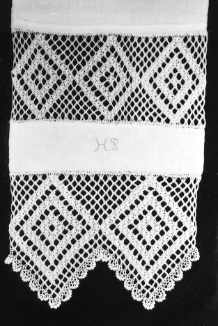 | huomiot | Osan tekniikka: käsityö/tekstiili; Osan materiaali: lanka; Osan mitat: leveys 31.00 cm; leveys 20.00 cm; Merkintätekniikka: ompelu; Osa: päätypitsi; välipitsi; Nimikointi: H.B; Koristelu: virkatut pitsit; Merkinnän kuvaus: vaaleanpunaisella puuvillalangalla kirjottu |