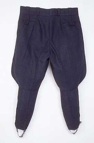 Saapashousumallia. Kangas on villatoimikasta, tummansinistä himmeän ruutukuvioista. Etukappaleissa on sinisestä nailonkankaasta vuori, joka ulottuu polven alapuolelle. Vyötärökaitale on 6 cm leveä, siinä on 8 vyölenkkiä. Sen päässä on 2 napinläpeä ja tummanruskeat kannalliset koristenapit yhteensä 4 kpl. Nappien halkaisija on 1,7 cm. Ne sijaitsevat 2-rivisesti. Etu- ja takataskuissa on napinläpi. Takataskut suljetaan napilla. Napit puuttuvat. Kapean lahkeen sivussa on polvipussiin asti halkio, jossa on 7 napinläpeä. Napeista 2 ylimmäistä on koristenappia ja loput pieniä housunnappeja. Lahkeen suun sisäpuolelle on kiinnitetty tukevaa reikäsukkanauhaa jalan alta alimmaiseen nappiin kiinnitettäväksi.