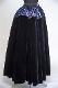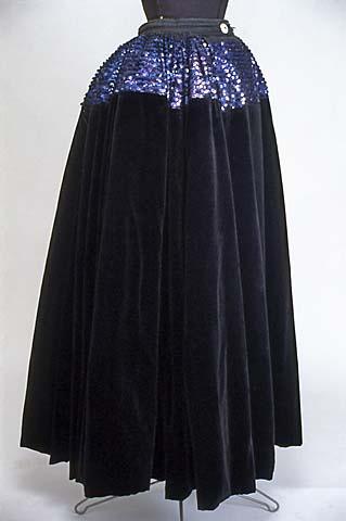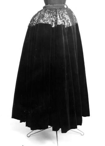 Juhla-asuun kuuluva hame. Mustaa samettia, paljettikoristeita. Vuorikangas mustaa tiivistä puuvillapalttinaa. Sametti ja vuori helmasta ommeltu koneella vastakkain. Vuori jatkuu yhtenä vyötäröön saakka. Hameen yläosa on 17 cm leveä, violetin värisillä paljettiriveillä koristettua sinistä silkkikangasta. Edessä keskellä n. 25 cm:n matka on ilman poimuja, sen sijaan kaksi syvää laskosta molemmin puolin ja halkio tämän laidassa. Hameessa on muuten 3 cm syviä vieri viereen kiinnitettyjä pystylaskoksia.