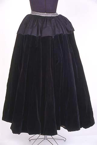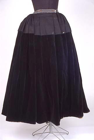 Nykyaikaiseen arkiasuun kuuluva hame, mustaa samettia. Vuori mustaa puuvillasatiinia, ommeltu helmaan kiinni, samoin ylhäällä 6 cm vyötäröltä alaspäin. Hameen yläosassa on 20 cm ohutta mustaa villasorsettia ja siinä on liitoskohdan yli ulottuva 8 cm leveä poikkilaskos. Edessä keskellä n. 25 cm halkion kohdalla on syvät litteät laskokset, kaksi molemmin puolin. Muu ympärys on 2 cm syvillä, vyötäröön vieri viereen kiinnitetyillä pystylaskoksilla.