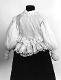 Vaaleansininen. Valkoista 5 cm leveää nylonpitsiä on sekä kauluksen reunassa, etuhalkion reunassa kahden puolen, olalta pyöreästi eteen kiinnitetyn 4 cm leveän röyhelön reunassa, vyötärölle taakse V-muotoisesti kiinnitetyn 4 cm leveän röyhelön reunassa ja 16 cm leveän pitkän suorakaiteen muotoisen helmakappaleen reunassa. Röyhelöiden ja helman kiinnitys on tehty 2-rivisesti poimuttaen siten, että siksakaten päärmätty reuna jää röyhelöksi päälle. Keskietu kiinnitetään painonapeilla. Etukappaleissa on kuminauha vyötäröllä. Takakappale on vyötäröltä istuva, kaartuu V-muotoisesti alas. Hiha on pitkä ja väljä, olalta poimutettu. Rannekkeena kolme paria kumilankaompeleita, pituus 15 cm. Suun päärmeeseen on pujotettu kuminauha.