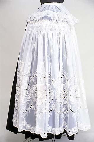 Valkoista brodeerattua nylonkangasta. Vyötärölle poimutetussa 20 cm:ssä kappaleessa on 9 cm leveä röyhelö, jonka alareunassa on 4,5 cm leveää nylonpitsiä. Tämä kappale on 150 cm pitkä. Helmaosa on 85 cm korkea. Sen yläreunassa on 4 poimulankaa 2 cm:n välein, alalankana kumilanka. Helmassa on pykäbroderaus kukkien kanssa. Sitten on 40 cm leveä broderaus ja loppuosa hentoa valkokirjontaa.