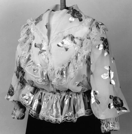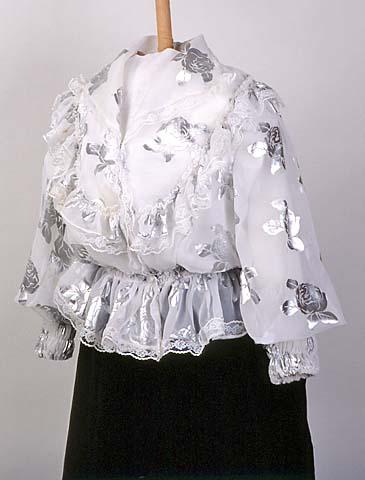 Valkoista hyvin ohutta sifonkia, jonka pinnassa hopeanvärisiä suurikokoisia ruusukuvioita. Valkoinen 2,5 cm leveä pitsi reunustaa kaulusta, helmaa ja etuhalkiota sekä olalta V-muotoisesti eteen kiinnitetyn 6 cm leveän röyhelön reunaa. Lisäksi takana vyötäröllä on V-muotoisen helmakiinnityksen yläpuolella samaan muotoon kiinnitetty pitsireunainen röyhelö. Helma muodostuu kahdesta 13 cm leveästä, suorakaiteen muotoisesta kaitaleesta, liitossauma takana keskellä. Helman kiinnitys takaa V-mallinen. Helmakaitale on yläreunastaan 1,5 cm välein poimuommeltu, siten että päärmeommeltu poimureuna jää röyhelöksi päälle. Poimuommelten väliin jäävään kujaan on etumuksessa pujotettu kuminauha. Helman alareunassa pitsi. Hihat ovat pitkät ja väljät, olalta poimutetut. Suun päärmeeseen on pujotettu kuminauha. Kumilankaompeleita on 3 cm välein siten, että muodostuu 15 cm pitkä joustava ranneke. Röijyn etuhalkio on painonapein kiinnitettävä. Olalta eteen kaartuvat röyhelöt yhdistyvät n. 15 cm helman kiinnitysreunan yläpuolella.