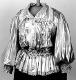 Hopeanväristä kiiltävää lamékangasta, kankaan sisäpuoli valkoinen. Valkoinen 2,5 cm leveä pitsi reunustaa kaulusta, helmaa ja etuhalkiota. Lisäksi takana vyötäröllä on V-muotoisen helmakiinnityksen yläpuolella samaan muotoon kiinnitetty pitsireunainen röyhelö. Helma muodostuu viidestä 15 cm leveästä suorakaiteen muotoisesta kaitaleesta, liitossaumat sivulla ja takana. Helmakaitaleen yläreuna on kapeasti päärmätty ja 2,5 cm välein poimuompeleella kiinnitetty siten, että kapea poimutusreuna jää päälle röyhelöksi. Poimuompeleiden väliin jäävään kujaan on etumuksessa pujotettu kuminauha. Helman alareunassa pitsi. Hihat ovat pitkät ja väljät, olalta poimutetut. 1 cm:n etäisyydellä hihansuusta on nauhakuja, johon pujotettu kuminauha: samalla hihansuuhun muodostuu kankaan reunasta kapea röyhelö. Kumilankaompeleita on 3 cm välein aina 2 rinnakkain siten, että muodostuu 17 cm pitkä joustava ranneke. Röijyn etuhalkio on painonapein kiinnitettävä. Etumuksen yläosa on koko hartialinjan mitalta ommeltu ensin 1,5 cm välein hiuslaskoksille, joita toisiinsa paikoitellen kiinni ompelemalla on luotu vohvelikuvioiset laskokset. Laskostettu osa kapenee alaspäin ja päättyy helman kiinnitysreunaan, etuhalkion molemmin puolin jäävän sileän osan viereen.