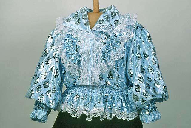 Vaaleansinistä keinosilkkiä, joka kauttaaltaan vaaleansinisin paljetein tehtyjen, 4 cm pitkien, pisaran muotoisten kuvioiden koristama. Valkoinen 3,5 cm - 4 cm leveä aaltoreunainen pitsi reunustaa kaulusta, helmaa ja etuhalkiota sekä olalta V-muotoisesti eteen kiinnitetyn 5,5 cm leveän röyhelön reunaa . Lisäksi takana vyötäröllä on V-muotoisen helmakiinnityksen yläpuolella samaan muotoon kiinnitetty röyhelö, jonka reunassa samaa pitsiä puolitettuna ja suorareunaisena. Helma muodostuu yhdestä pitkästä, suorakaiteen mallisesta 11 cm leveästä kaitaleesta. Helman kiinnitys takaa V-mallinen. Helmakaitale on yläreunastaan kapeasti päärmätty ja 2 cm välein poimuommeltu siten, että kapea poimutusreuna jää röyhelöksi päälle. Helman alareunassa pitsi. Hihat ovat pitkät ja väljät, olalta poimutetut. Suun päärmeeseen on pujotettu kuminauha . Kuminlankaompeita on 2,5 cm välein 2 rinnakkain, viimeistä yksittäistä kumilankaommelta lukuunottamatta siten, että muodostuu 14 cm pitkä joustava ranneke. Röijyn etuhalkio on painonapein kiinnitettävä. Etumuksen molemmin puolin ylhäällä 17 cm pitkät pystylaskokset, jotka kiinnittyvät olkasauman puoliväliin. Vyötäröllä 8 cm pitkät muotolaskokset.