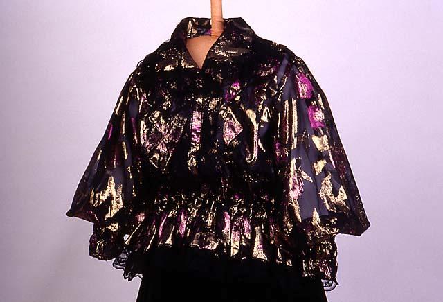 Kankaan pohja mustaa, läpikuultavaa, harsomaista kangasta, jossa erisävyisin aniliininpunaisin ja kullanvärisin kiiltolangoin tehtyä kukkakuviointia. Musta 5 cm leveä pitsi reunustaa kaulusta, etuhalkiota ja helmaa sekä etumuksen sivuliepeitä. Takana on lisäksi vyötäröllä V-mallisen helmakiinnityksen yläpuolella samaan muotoon kiinnitetty pitsireunainen röyhelö. Helma muodostuu kolmesta suorakaiteen mallisesta, 14 cm leveästä kaitaleesta. Helman kiinnitys takana V-mallinen. Helmakaitale on yläreunastaan kapeasti päärmätty ja 2,5 cm välein poimuompeleella kiinnitetty siten, että kapea poimutusreuna jää päälle röyhelöksi. Poimuompeleiden väliin jäävään kujaan on etumuksessa pujotettu kuminauha. Hihat ovat pitkät ja väljät, olalta poimutetut. Suun päärmeeseen on pujotettu kuminauha. Kumilankaompeleita on 3,5 cm välein aina 2 rinnakkain siten, että muodostuu 13 cm pitkä joustava ranneke. Röijyn pitsireunusteinen etuhalkio on painonapein kiinnitettävä. Halkion molemmin puolin kankaasta tehdyt siksak-malliset liepeet, joiden alla kulkee musta pitsi, näkyen aina kärkien väleistä.