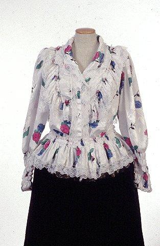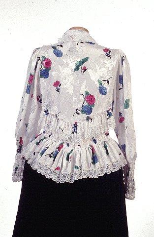 Kangas on valkoista ruusunkukkakuvioista keinosilkkiä. Etuhalkiossa viisi nepparia. Kauluksen reunassa on kapea pitsi joka ulottuu oikealla puolen halkiota helman yläreunaan asti. Olkapäältä rinnalle lähtevät kaarevat röyhelöt joiden alareunassa nylonpitsi. Olkapäillä rypytys. Helman alareunassa on nylonpitsi. Helman yläreuna on päärmätty ja rypytetty etu- ja takakappaleiden päälle. Helman molemmissa päissä on kumilankagalla varustettu joustava osuus. Selkäpuolella v-muotoinen röyhelö jonka alareunassa pitsi. Hihojen alaosat ommeltu kuudella päällekkäisellä kumilangalla joustavaksi rannekkeeksi. Hihansuun päärmeeseen on pujotettu kumilanka.