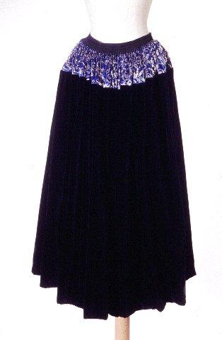 Kolminkertainen päällyshame. Alimmaisena musta puuvillainen vuorikangas, päällä musta sametti ja näiden välissä sininen silkkikangas joka on päällimmäisenä kankaana vyötärökaitaleessa. Yläosassa sinisen silkin päällä mustaa ohutta verkkoa johon on kirjailtu hopealangoilla lehtikuvioita. Samettikangas on ommeltu yhteen kuudesta kaitaleesta ja kiinnitetty helmasta vuoriin ja vyötäröltä yläosan silkkikankaaseen. Halkio on suljettu kahdella napilla.