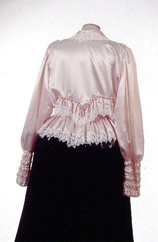 Valmistettu vaaleanpunaisesta silkkisatiinista. Valkoinen puuvillapitsireunus jatkuu kauluksesta etuhalkion molemmin puolin helmaan asti. Pitsiä on myös olalta V-muotoisesti eteen kiinnitetyn röyhelön oikeassa reunassa sekä selkäpuolella olevan V-muotoisen röyhelön reunassa. Helma on suorakaiteen muotoinen, yläreunasta päärmätty ja poimutettu. Yläreunan päärmeen oikealle puolelle pujotettu kuminauhaa n. 15 cm. matkalle. Helman alareunassa on valkoinen puuvillapitsi. Hihat ovat pitkät, väljät ja olalta poimutetut. Suun päärmeeseen on pujotettu leveä kuminauha ja siitä ylöspäin joustava ranneke, joka on tehty viidellä kaksinkertaisella kumilangalla tehdyn ompeleen avulla. Etuhalkio on kiinnitetty kuudella teräsnepparilla (painonapilla).