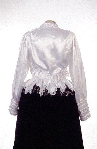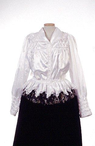 Kangas valkoista kiiltävää silkkisatiinia. Kapea valkoinen nylonpitsireunus jatkuu kauluksesta etuhalkion oikealla puolella helmaan asti. Pitsiä on myös selkäpuolella olevan V-muotoisen röyhelön reunassa. Helma on suorakaiteen muotoinen, yläreunasta päärmätty ja poimutettu. Vyötärölle yläreunan päärmeen loppupäähän on pujotettu leveä kuminauha. Pykäläreunaisen helman alareunassa on valkoinen nylonpitsi. Hihat ovat pitkät, väljät ja olalta poimutetut. Suun päärmeeseen on pujotettu leveä kuminauha ja siitä ylöspäin joustava ranneke, joka on tehty viidellä kumilangalla tehdyn ompeleen avulla. Etuhalkio on kiinnitetty viidellä teräsnepparilla (painonapilla).