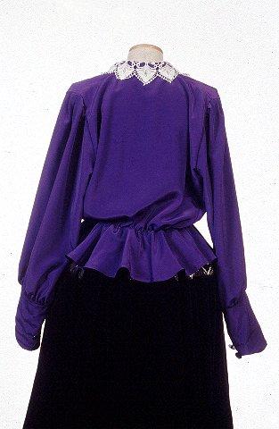 Valmistettu sinisestä keinokuidusta. Kauluksessa on pykäreunainen puuvillapitsi. Etuhalkio on kiinnitetty kolmella mustalla muovinapilla. Helmakaitale on tehty kolmesta kappaleesta. Sen yläreunaan sisäpuolelle on ommeltu kumilanka jolla on tehty rypytys. Hihat on rypytetty olkapäiltä ja niiden suihin on ommeltu kaksi samanlaista muovinappia kuin etuhalkioon. Joustamaton ranneke on tehty kaksin kerroin käännetystä samanlaisesta kankaasta kuin muukin vaate.