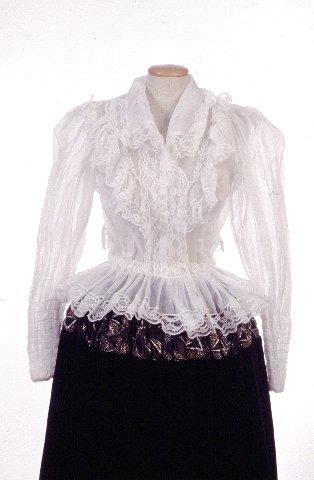 | huomiot | Osan tekniikka: käsityö/tekstiili; Osan mitat: pituus 40.00 cm; leveys 11.00 cm; pituus 63.00 cm; leveys 5.00 cm; pituus 38.00 cm; pituus 27.00 cm; ympärysmitta 77.00 cm; Osan materiaali: kangas; lanka; Kontekstiaika: 1999 - 2000; Osa: etukappale; helma (ilman pitsiä); hiha; pitsi; takakappale; takaröyhelö; vyötärö(venytettynä) |
