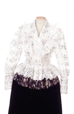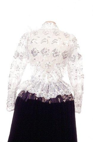 | huomiot | Osan tekniikka: käsityö/tekstiili; Osan mitat: pituus 38.00 cm; leveys 12.00 cm; pituus 60.00 cm; leveys 4.00 cm; pituus 36.00 cm; pituus 24.00 cm; ympärysmitta 80.00 cm; Osan materiaali: kangas; lanka; Osa: etukappale; helma ilman pitsiä; hiha; pitsi; takakappale; takaröyhelö; vyötärö venytettynä |