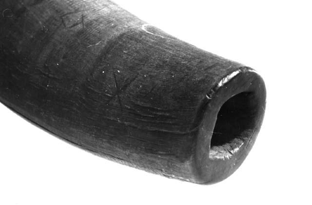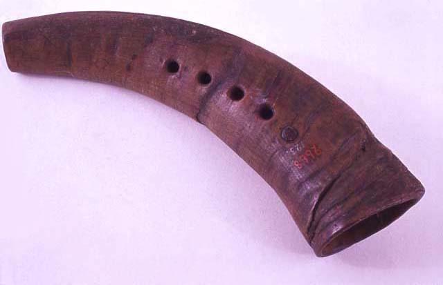 Pukin sarvesta tehty soitin, jossa on neljä sormiaukkoa. Alinta sormiaukkoa varten porattu alkuperäinen aukko on tukittu tulpalla todennäköisesti virityksen tarkistamisen yhteydessä.