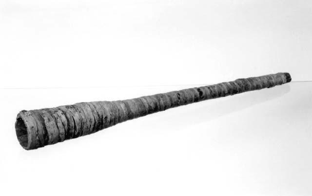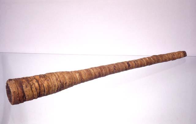 Suurikokoinen suora puutrumpetti, jonka tuohella päällystetty halkioputkinen ja kapea runko päättyy kaikusuppiloon.