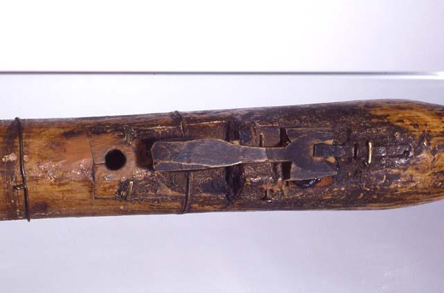 | huomiot | Arkistolähde: Kauko, Olavi: Suomen kansallismuseon kokoelmien huilut ja klarinetit. Musiikkitieteen laudatur-tutkielma. Helsingin yliopisto, 1954.; Osan mitat: halkaisija 7.00 cm; pituus 49.00 cm; pituus 6.30 cm; Osan materiaali: puu; Kirjallisuus: Herman Saxbergistä ks. esim. Karhunsoutaja VI, Keurusselän Seuran kotiseutujulkaisu 1999.; Osa: kaikusuppilo; lyhyet läpät; pitkät läpät; runko; suukappaleen suojus |