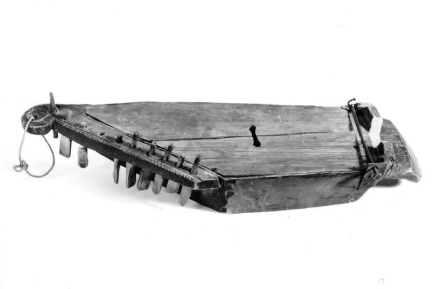 10-kielinen kantele. Yksipuinen, tasapohjainen koppa on koverrettu päältäpäin ontoksi ja peitetty kannella. Kansi on upotettu paksuudeltaan koppaan ja kiinnitetty rautanauloilla. Metallikieliä on jäljellä 9, samoin puisia viritystappeja. Tappien pituudet vaihtelevat välillä 6,5 - 10 cm. Keskeltä haljenneessa kannessa on yksi pitkänomainen, päistään levenevä ääniaukko, pituudeltaan 4,5 cm. Ponnen yläosassa on 2,5 cm syvä ja 4 cm leveä lovi. Varras on tehty rautanaulasta. Ponnesta ovat rikkoutuneet vartaan kiinnityspaikat ja varras on kiinnitetty pitkän sivun puolelta kahdella rautanaulalla ja lyhyen sivun puolelta peltilevyllä. Kanteleen kärjessä on pyöreä kierukka, jossa on reikä ja siinä ripustusnarulenkki. Kierukassa on koristeura ja lovileikkauksia, jotka jatkuvat myös lavassa.