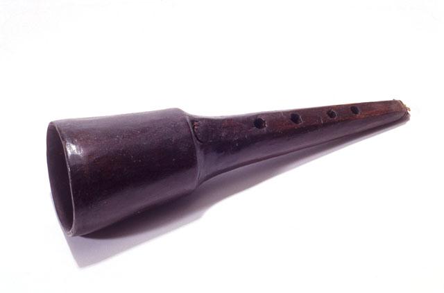 Puusta koverrettu, tummaksi petsattu klarinettisoitin, jossa neljä puukolla kaiverrettua sormiaukkoa. Puhalluspäässä olevaan halkioon on työnnetty katajalehdykkä, joka kiinnitetty messinkilangalla. Valmistajan tiedon mukaan soittimella on voinut puhaltaa kaikkiaan 8 säveltä.
