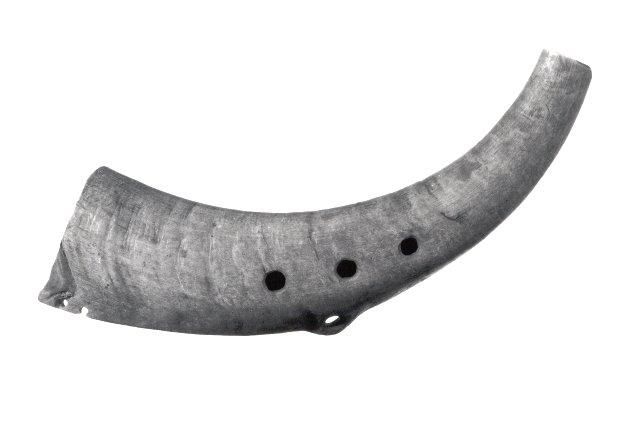 Pukin sarvesta tehty soitin, jossa kolme sormiaukkoa ja reunassa yksi ripustusreikä.