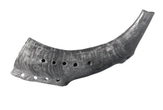 Pukin sarvesta tehty soitin, jossa viisi sormiaukkoa ja viisi ripustusta varten tehtyä reikää.