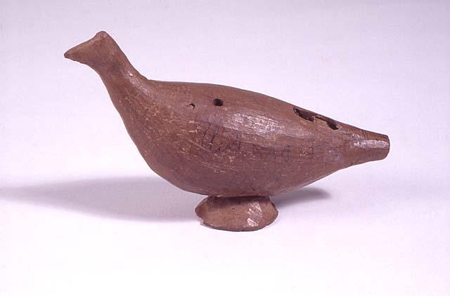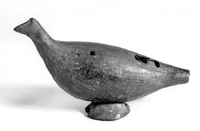 Linnun muotoinen savihuilu, muoto muistuttaa lähinnä teertä. Lajityypiltään matala yläsärmäinen savikukko. Särmäaukon muoto vastaa nokkahuilua. Maalaamatonta, tummanruskeaa savea.