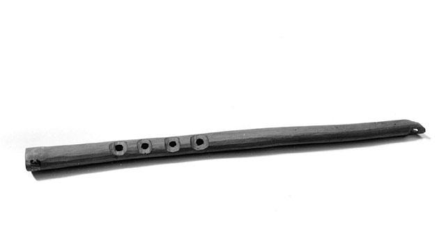 Mäntyinen siirtotulppahuilu, jossa neljä sormiaukkoa. Museoon tullessaan huilun on sanottu olleen uuden, mutta hyvin vanhaa mallia.
